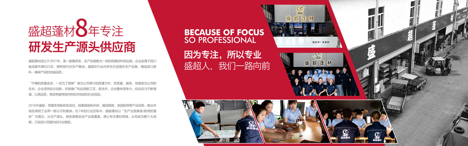 盛超蓬材是由四川超諾商貿有限公司創辦,是一家集研發、生產、銷售和服務于一體的專業雨蓬供應商。主要產品:實心耐力板,中空陽光板、多層板、蜂窩板、鋁瓦、消聲鋁瓦、不銹鋼消聲等材料的雨蓬產品。自主研發多款雨蓬,擁有自己的專利和檢測報告。其中明星產品新型組裝式雨蓬,擁有組裝簡便,美觀耐用、抗噪音,性價比高等優勢,多項檢測指標領跑同行業。受到了市場和經銷商的高度認可。 公司自成立至今,從銷售到研發再到生產,已經過了3次跨越式的發展。2017年已成為四川雨蓬行業內庫房面積大,員工多的一家公司。產值每年以平均20%的速度快速增長。可以說客戶是我們的老師,和他們合作使我們得到很多的學習機會來提高自身的技術水平和管理水平,是我們生產和發展的動力。